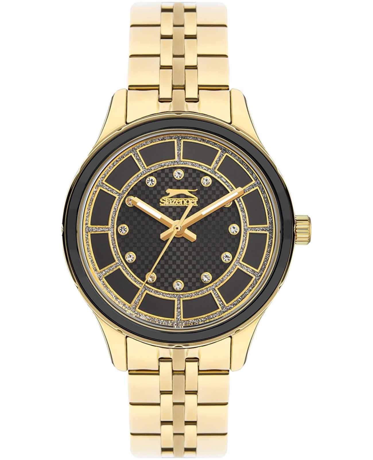 Женские наручные часы Slazenger SL.09.2295.3.03 — это элегантный аксессуар, который подчеркнет утончённый стиль своей обладательницы. Корпус диаметром 36 мм и толщиной 11,5 мм выполнен из прочного металла с золотистым IP-покрытиемIP-покрытиеМетод ионного напыления. Демонстрирует повышенную устойчивость к истиранию, окислению и химическим веществам. Под воздействием высокого давления и температуры около 1500°C молекулы металла надёжно соединяются с частицами корпуса часов. и надёжно защищён минеральным стекломМинеральное стеклоМинеральное стекло представляет собой искусственно выращенный минерал кварца. Такое стекло отличается особой устойчивостью к повреждениям и царапинам. Уступает по некоторым качествам сапфировому стеклу., устойчивым к царапинам. Черный циферблат украшен изящными кристаллами, придающими часам особый блеск и изысканность. Модель оснащена люминесцентным покрытиемЛюминесцентное покрытиеПозволяет считывать показания времени в темноте. Производители наносят на стрелки, часовые индексы, безель или поверхность циферблата светонакопительный состав, дающий холодное свечение. стрелок, что облегчает считывание времени в темноте. Особое внимание привлекает безельБезельВнешний ободок, закрепляющий стекло. В спортивных часах так называется поворотное кольцо с делениями на циферблате, выполняет роль таймера – замеряет отрезки времени на шкале. Неподвижный безель – элемент декора. Однонаправленно вращающийся безель на дайверских часах позволяет фиксировать моменты погружения и выныривания на поверхность. с черным IP-покрытиемIP-покрытиеМетод ионного напыления. Демонстрирует повышенную устойчивость к истиранию, окислению и химическим веществам. Под воздействием высокого давления и температуры около 1500°C молекулы металла надёжно соединяются с частицами корпуса часов.. Металлический браслет с золотистым IP-покрытиемIP-покрытиеМетод ионного напыления. Демонстрирует повышенную устойчивость к истиранию, окислению и химическим веществам. Под воздействием высокого давления и температуры около 1500°C молекулы металла надёжно соединяются с частицами корпуса часов. шириной 16 мм оснащён удобной раскладной застёжкойРаскладная застёжкаТакой тип застёжки используется только на браслетах из металла. Она никогда не раскрывается полностью, происходит разделение на 2 и более частей. Раскладывающая застёжка снизит вероятность потери часов к минимуму. для комфортной посадки на запястье. Кварцевый механизм обеспечивает точность хода, а водозащита уровня WR 30 защищает часы от случайных брызг. Для удобства в условиях плохой освещённости предусмотрена подсветка стрелок. Вес изделия составляет 95 граммов.