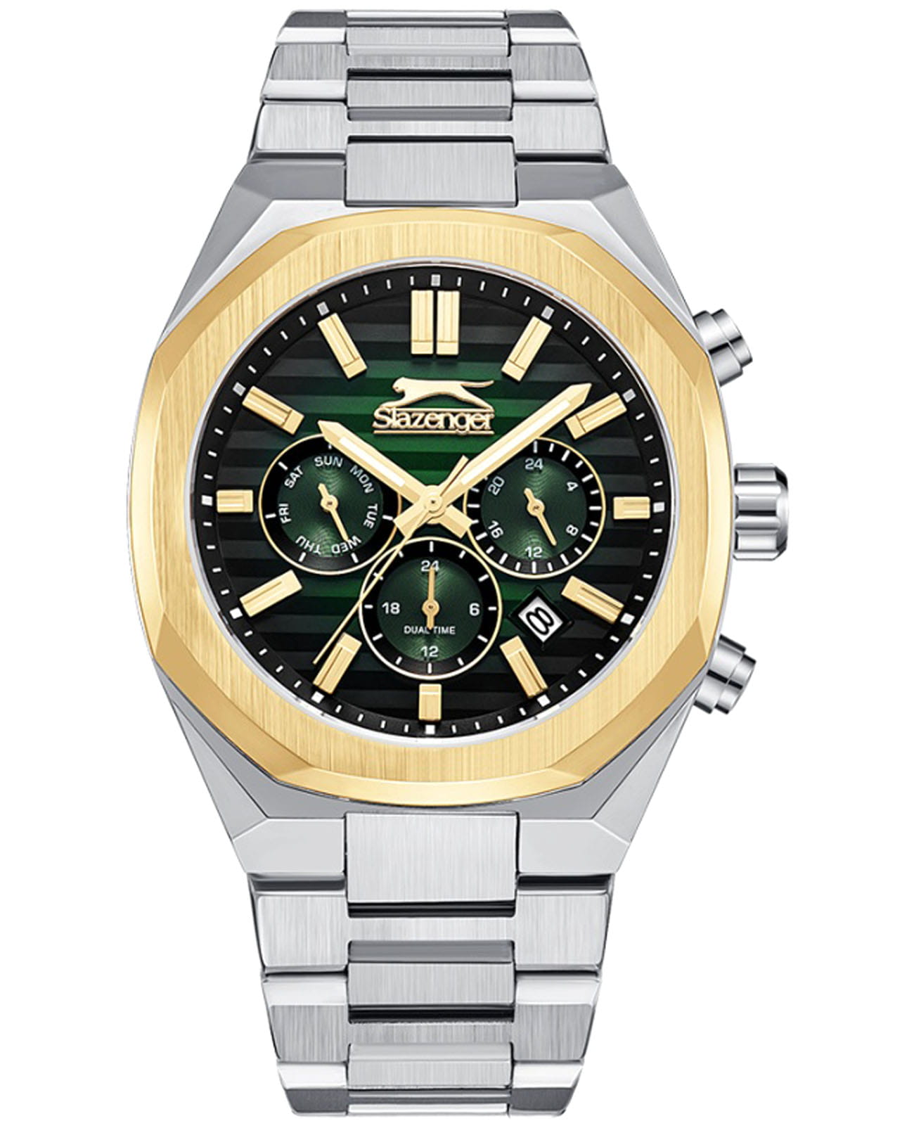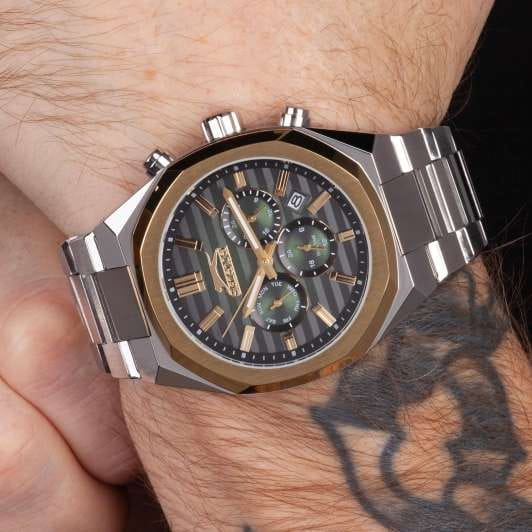 Мужские кварцевые часы Slazenger SL.09.2345.2.05 – идеальное сочетание классического дизайна и современных технологий, созданное для уверенных в себе мужчин. Корпус выполнен из суперметалла серебристого цвета, диаметром 43 мм и толщиной 12 мм, подчёркивает надежность модели и делает их идеальным аксессуаром для любой ситуации – будь то деловая встреча или повседневные выходы. Циферблат надёжно защищён минеральным стекломМинеральное стеклоМинеральное стекло представляет собой искусственно выращенный минерал кварца. Такое стекло отличается особой устойчивостью к повреждениям и царапинам. Уступает по некоторым качествам сапфировому стеклу., которое устойчиво к механическим повреждениям и сохраняет кристальную прозрачность. Неподвижный безельБезельВнешний ободок, закрепляющий стекло. В спортивных часах так называется поворотное кольцо с делениями на циферблате, выполняет роль таймера – замеряет отрезки времени на шкале. Неподвижный безель – элемент декора. Однонаправленно вращающийся безель на дайверских часах позволяет фиксировать моменты погружения и выныривания на поверхность. с IP-покрытиемIP-покрытиеМетод ионного напыления. Демонстрирует повышенную устойчивость к истиранию, окислению и химическим веществам. Под воздействием высокого давления и температуры около 1500°C молекулы металла надёжно соединяются с частицами корпуса часов. золотистого цвета. Браслет из суперметалла удобно облегает запястье и фиксируется с помощью раскладной застёжкиРаскладная застёжкаТакой тип застёжки используется только на браслетах из металла. Она никогда не раскрывается полностью, происходит разделение на 2 и более частей. Раскладывающая застёжка снизит вероятность потери часов к минимуму., обеспечивая надёжность и комфорт в повседневном ношении. Стрелки и метки покрыты люминесцентным покрытиемЛюминесцентное покрытиеПозволяет считывать показания времени в темноте. Производители наносят на стрелки, часовые индексы, безель или поверхность циферблата светонакопительный состав, дающий холодное свечение., обеспечивающим отличную читаемость в темноте. Эти часы станут не просто аксессуаром, а надежным спутником в любой ситуации, подчеркивая ваш безупречный вкус и деловой стиль. Окошко даты находится в положении между 4 и 5 часов. Вынесенный циферблат с 24-х часовым указателем времени. Водозащита до 50 метров позволит защитить корпус от случайных брызг или капель дождя. Функция GMTGMTОтображение времени второго часового пояса.Такая функция особенно актуальна для путешественников и бизнесменов,которые общаются с людьми из разных стран,теперь вы всегда будете знать,какой час у вашего партнёра или близкого человека. поможет отслеживать время второго часового поясаВторой часовой поясФункция, позволяющая отображать время двух часовых поясов одновременно..