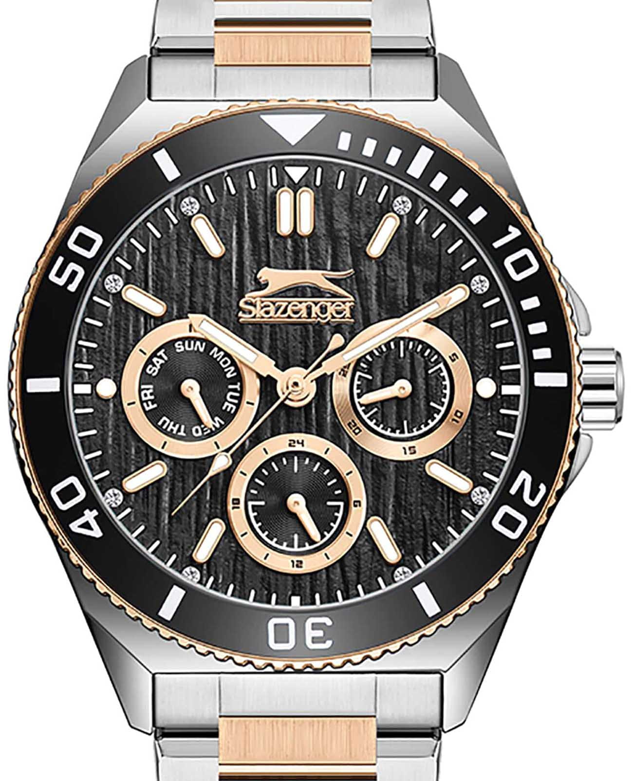 Женские кварцевые часы Slazenger SL.09.2371.2.04 – это сочетание элегантности, современного стиля и надёжности. Изящный корпус из суперметалла серебристого цвета, диаметром 38.5 мм и толщиной 11 мм, подчёркивает утончённость модели и делает их идеальным аксессуаром для любой ситуации – будь то деловая встреча, романтический вечер или повседневные выходы. Циферблат надёжно защищён минеральным стекломМинеральное стеклоМинеральное стекло представляет собой искусственно выращенный минерал кварца. Такое стекло отличается особой устойчивостью к повреждениям и царапинам. Уступает по некоторым качествам сапфировому стеклу., которое устойчиво к механическим повреждениям и сохраняет кристальную прозрачность. БезельБезельВнешний ободок, закрепляющий стекло. В спортивных часах так называется поворотное кольцо с делениями на циферблате, выполняет роль таймера – замеряет отрезки времени на шкале. Неподвижный безель – элемент декора. Однонаправленно вращающийся безель на дайверских часах позволяет фиксировать моменты погружения и выныривания на поверхность. с IP-покрытиемIP-покрытиеМетод ионного напыления. Демонстрирует повышенную устойчивость к истиранию, окислению и химическим веществам. Под воздействием высокого давления и температуры около 1500°C молекулы металла надёжно соединяются с частицами корпуса часов. черного цвета. Браслет из суперметалла с частичным IP-покрытиемIP-покрытиеМетод ионного напыления. Демонстрирует повышенную устойчивость к истиранию, окислению и химическим веществам. Под воздействием высокого давления и температуры около 1500°C молекулы металла надёжно соединяются с частицами корпуса часов. удобно облегает запястье и фиксируется с помощью раскладной застёжкиРаскладная застёжкаТакой тип застёжки используется только на браслетах из металла. Она никогда не раскрывается полностью, происходит разделение на 2 и более частей. Раскладывающая застёжка снизит вероятность потери часов к минимуму., обеспечивая надёжность и комфорт в повседневном ношении. Утончённый стиль, внимание к деталям и практичность делают эту модель идеальным выбором для современных женщин, ценящих эстетику и функциональность. Стрелки и метки покрыты люминесцентным покрытиемЛюминесцентное покрытиеПозволяет считывать показания времени в темноте. Производители наносят на стрелки, часовые индексы, безель или поверхность циферблата светонакопительный состав, дающий холодное свечение., обеспечивающим отличную читаемость в темноте. Вынесенный циферблат с 24-х часовым указателем времени украшен фианитами. Водозащита до 30 метров позволит защитить корпус от случайных брызг или капель дождя.