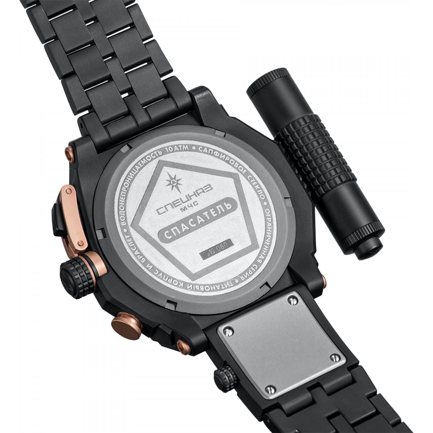 Часы Спецназ "5 Стихий" С9153341-5130.D — коллекционная модель, посвящённая стихии Огня, символизирующая доблесть спасателей. Корпус диаметром 50 мм выполнен из титана с PVD-покрытиемPVDУльтратонкое покрытие наносится в технике вакуумного напыления, сочетает в себе нитрид титана особой прочности со слоем золота или оксида хрома. Несёт в себе декоративную или защитную функцию. золотого цвета, а чёрный циферблат защищён сапфировым стекломСапфировое стеклоПрочный и надёжный материал из кристалла сапфира синтетического происхождения, характеризующийся особой твёрдостью и устойчивостью к царапинам и повреждениям. с антибликовым покрытием.