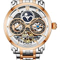 Мужские наручные часы Stührling Original 371B.05 из коллекции Luciano Automatic Skeleton сочетают в себе классический дизайн и современные технологии . Модель оснащена механическим механизмом с автоподзаводом, что гарантирует точность хода без необходимости ручного завода . Корпус часов диаметром 46 мм изготовлен из нержавеющей стали, что подчеркивает элегантность модели . БезельБезельВнешний ободок, закрепляющий стекло. В спортивных часах так называется поворотное кольцо с делениями на циферблате, выполняет роль таймера – замеряет отрезки времени на шкале. Неподвижный безель – элемент декора. Однонаправленно вращающийся безель на дайверских часах позволяет фиксировать моменты погружения и выныривания на поверхность. с PVD-покрытиемPVDУльтратонкое покрытие наносится в технике вакуумного напыления, сочетает в себе нитрид титана особой прочности со слоем золота или оксида хрома. Несёт в себе декоративную или защитную функцию.. Защиту циферблата обеспечивает прочное стекло KrysternaKrysternaKrysterna — инновационное стекло для наручных часов. Благодаря уникальной структуре, Krysterna объединяет ключевые преимущества двух материалов: твердость сапфира, защищающую от царапин, и гибкость минерального стекла, обеспечивающую устойчивость к деформациям. Такая комбинация делает его идеальным решением для часов, подверженных экстремальным нагрузкам, сохраняя при этом оптическую прозрачность., известное своей устойчивостью к царапинам и механическим повреждениям . Циферблат выполнен в стиле , что позволяет наблюдать за работой внутреннего механизма и демонстрирует сложность инженерного решения . Такой дизайн делает модель не только функциональной, но и стильной, привлекая внимание ценителей сложных технических решений. Часы оснащены функцией второго часового поясаВторой часовой поясФункция, позволяющая отображать время двух часовых поясов одновременно. и анимированным индикатором AM/PM в виде солнца и луны, что делает их удобными для путешественников . Водонепроницаемость модели достигает 5 атмосфер (50 метров), что позволяет использовать их в повседневных условиях, включая контакт с водой, например, при мытье рук или дожде . Заводная головка с системой завинчивания обеспечивает дополнительную защиту механизма от внешних воздействий.