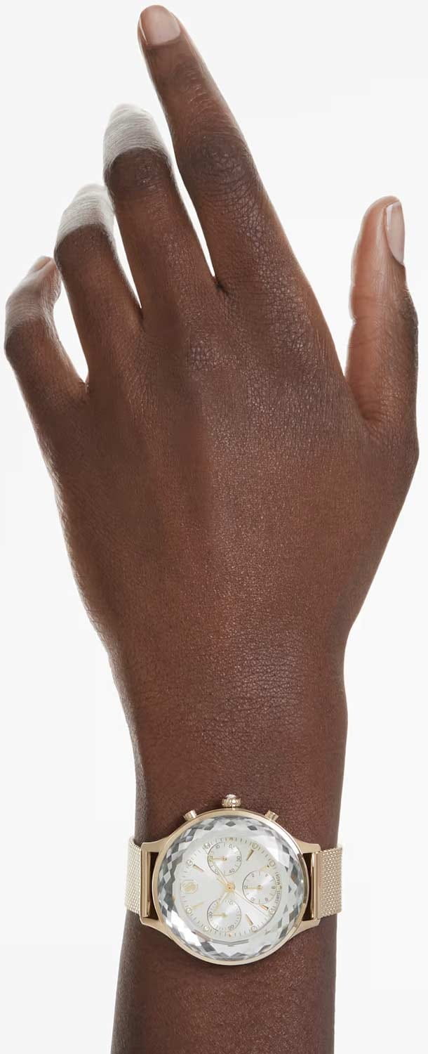 Часы Swarovski 5677500 представляют собой изысканное сочетание стиля и функциональности, идеально подходящее для ценителей элегантных аксессуаров. Эти швейцарские кварцевые часы с хронографомХронографФункция позволяет измерять отрезки времени с особой точностью: часы, минуты, секунды. Верным признаком хронографа является наличие на циферблате 3 дополнительных окошек-счётчиков. и секундомеромСекундомерСекундоме́р — прибор, способный измерять интервалы времени с точностью до долей секунды. заключены в корпус из стали с золотистым PVDPVDУльтратонкое покрытие наносится в технике вакуумного напыления, сочетает в себе нитрид титана особой прочности со слоем золота или оксида хрома. Несёт в себе декоративную или защитную функцию. покрытием, который дополнен серебристым циферблатом. Циферблат выполнен по технологии Sunray (солнечные лучи), украшен логотипом Swarovski в виде лебедя в положении 12 часов. Метки в виде штрихов и точек с кристаллами. Три счетчика хронографаХронографФункция позволяет измерять отрезки времени с особой точностью: часы, минуты, секунды. Верным признаком хронографа является наличие на циферблате 3 дополнительных окошек-счётчиков. предназначены для отдельного измерения часов, минут и секунд. Минеральное стеклоМинеральное стеклоМинеральное стекло представляет собой искусственно выращенный минерал кварца. Такое стекло отличается особой устойчивостью к повреждениям и царапинам. Уступает по некоторым качествам сапфировому стеклу. надежно защищает циферблат, а водозащита 50 WR позволяет не беспокоиться о контакте с водой в повседневных ситуациях. Эти часы не только точные и надежные, благодаря кварцевому механизму, но и невероятно стильные, благодаря безелюБезельВнешний ободок, закрепляющий стекло. В спортивных часах так называется поворотное кольцо с делениями на циферблате, выполняет роль таймера – замеряет отрезки времени на шкале. Неподвижный безель – элемент декора. Однонаправленно вращающийся безель на дайверских часах позволяет фиксировать моменты погружения и выныривания на поверхность. и стальному браслету с PVDPVDУльтратонкое покрытие наносится в технике вакуумного напыления, сочетает в себе нитрид титана особой прочности со слоем золота или оксида хрома. Несёт в себе декоративную или защитную функцию. покрытием из миланского плетения с раскладным замкомРаскладной замокДанный вариант застежки используется только на часах с металлическим браслетом. Отличительная особенность такого крепления в том, что длина браслета становится универсальной и вы можете самостоятельно отрегулировать нужный вам размер – застежка просто двигается по браслету часов., что обеспечивает комфортное ношение и стильный внешний вид. Заводная головка дополнительно украшена кристаллом круглой огранки, придающим часам завершенность и изящество. Люминесцентное покрытиеЛюминесцентное покрытиеПозволяет считывать показания времени в темноте. Производители наносят на стрелки, часовые индексы, безель или поверхность циферблата светонакопительный состав, дающий холодное свечение. на стрелках обеспечивает отличную видимость в темноте. Эти часы не просто аксессуар, а настоящее произведение искусства, способное стать ярким акцентом любого образа.