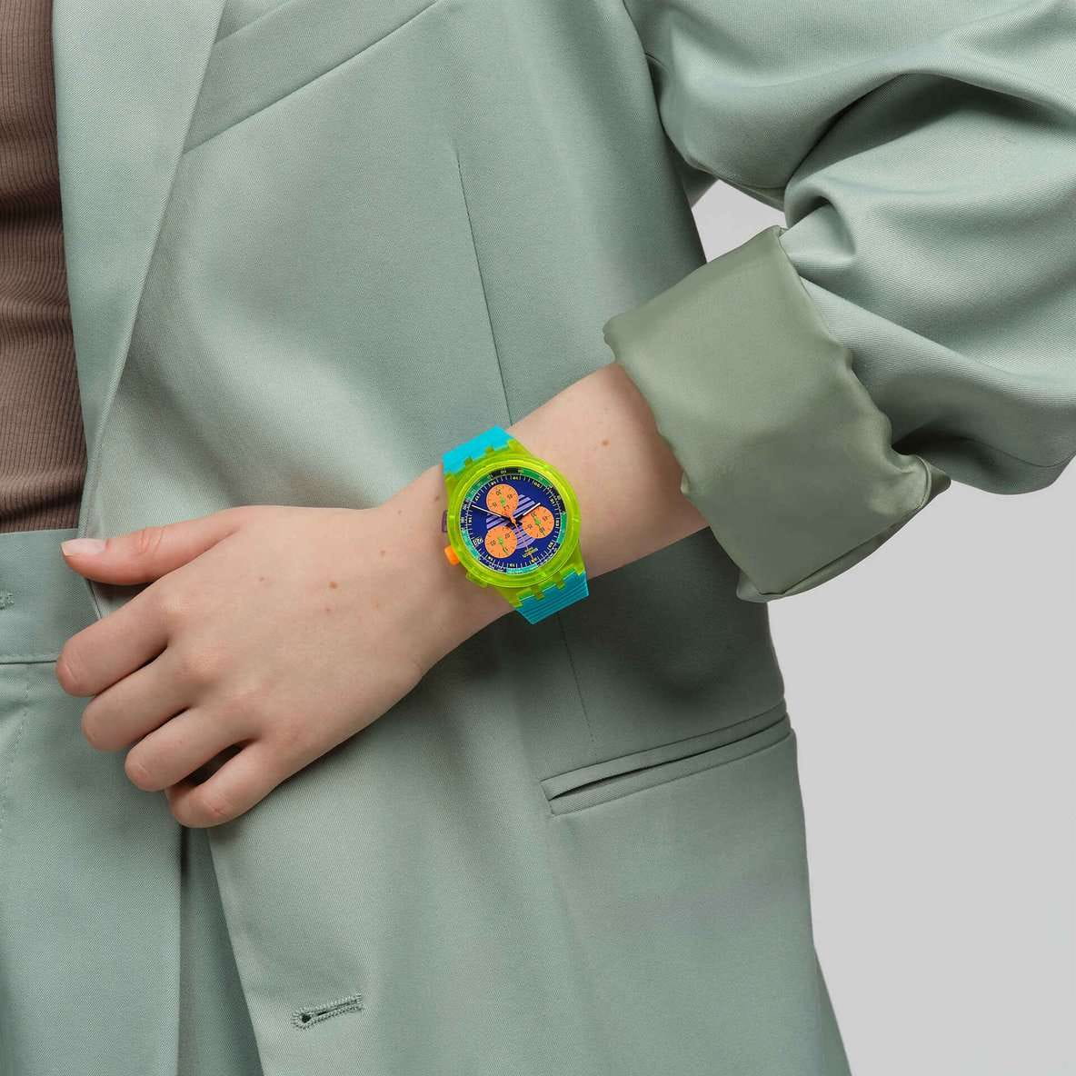 Часы Swatch SUSJ404 — это стильный и современный аксессуар для тех, кто ценит лёгкость и комфорт. Часы идеально подойдут как для мужчин, так и для женщин. Этот хронографХронографФункция позволяет измерять отрезки времени с особой точностью: часы, минуты, секунды. Верным признаком хронографа является наличие на циферблате 3 дополнительных окошек-счётчиков. неоновой расцветки создан по мотивам модели Swatch CHRONO 90-х годов: NEO WAVE (SCJ100). На разноцветном циферблате имеются шкала тахиметраТахиметрРазмеченная шкала, располагается на ободке или безеле часов. Тахиметр позволяет рассчитать скорость на определённом участке пути, расстояние измеряется в километрах или милях. и окошко календаря на уровне 3-часовой отметки. Часовая и минутная стрелки черного цвета, а также оранжевая секундная светятся в темноте благодаря люминесцентному покрытиюЛюминесцентное покрытиеПозволяет считывать показания времени в темноте. Производители наносят на стрелки, часовые индексы, безель или поверхность циферблата светонакопительный состав, дающий холодное свечение.. Часы заключены в прозрачный корпус матово-желтой расцветки с таким же безелемБезельВнешний ободок, закрепляющий стекло. В спортивных часах так называется поворотное кольцо с делениями на циферблате, выполняет роль таймера – замеряет отрезки времени на шкале. Неподвижный безель – элемент декора. Однонаправленно вращающийся безель на дайверских часах позволяет фиксировать моменты погружения и выныривания на поверхность.. На фактурном бирюзовом ремешке контрастно выделяются полупрозрачные тренчики желтого и оранжевого цвета и синяя пряжка. Водозащита 30 метров делает часы практичными для повседневного использования. Эти часы подойдут для повседневного ношения и станут ярким акцентом в вашем наряде.