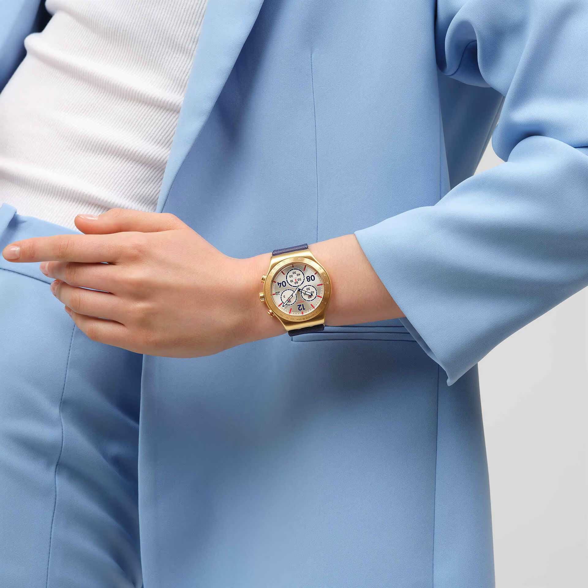 Мужские наручные часы-хронографХронографФункция позволяет измерять отрезки времени с особой точностью: часы, минуты, секунды. Верным признаком хронографа является наличие на циферблате 3 дополнительных окошек-счётчиков. Swatch CAPTAIN'S DREAM YVG419 — это стильный и современный аксессуар для тех, кто ценит лёгкость и комфорт. Корпус выполнен из нержавеющей стали с PVD-покрытиемPVDУльтратонкое покрытие наносится в технике вакуумного напыления, сочетает в себе нитрид титана особой прочности со слоем золота или оксида хрома. Несёт в себе декоративную или защитную функцию. цвета розового золота, диаметром 43 мм и толщиной 12.67 мм, что обеспечивает долговечность и утончённый внешний вид. Циферблат защищён минеральным стекломМинеральное стеклоМинеральное стекло представляет собой искусственно выращенный минерал кварца. Такое стекло отличается особой устойчивостью к повреждениям и царапинам. Уступает по некоторым качествам сапфировому стеклу., устойчивым к повреждениям. Модель оснащена кварцевым механизмом, обеспечивающим высокую точность хода. Шкала тахиметраТахиметрРазмеченная шкала, располагается на ободке или безеле часов. Тахиметр позволяет рассчитать скорость на определённом участке пути, расстояние измеряется в километрах или милях. на безелеБезельВнешний ободок, закрепляющий стекло. В спортивных часах так называется поворотное кольцо с делениями на циферблате, выполняет роль таймера – замеряет отрезки времени на шкале. Неподвижный безель – элемент декора. Однонаправленно вращающийся безель на дайверских часах позволяет фиксировать моменты погружения и выныривания на поверхность.. Стрелки и метки с люминесцентным покрытиемЛюминесцентное покрытиеПозволяет считывать показания времени в темноте. Производители наносят на стрелки, часовые индексы, безель или поверхность циферблата светонакопительный состав, дающий холодное свечение.. Тканевый ремешок на стандартной застёжке гармонично дополняет корпус и обеспечивает комфортное ношение. Водозащита 30 метров делает часы практичными для повседневного использования. Эти часы подойдут для повседневного ношения и станут ярким акцентом в вашем наряде.