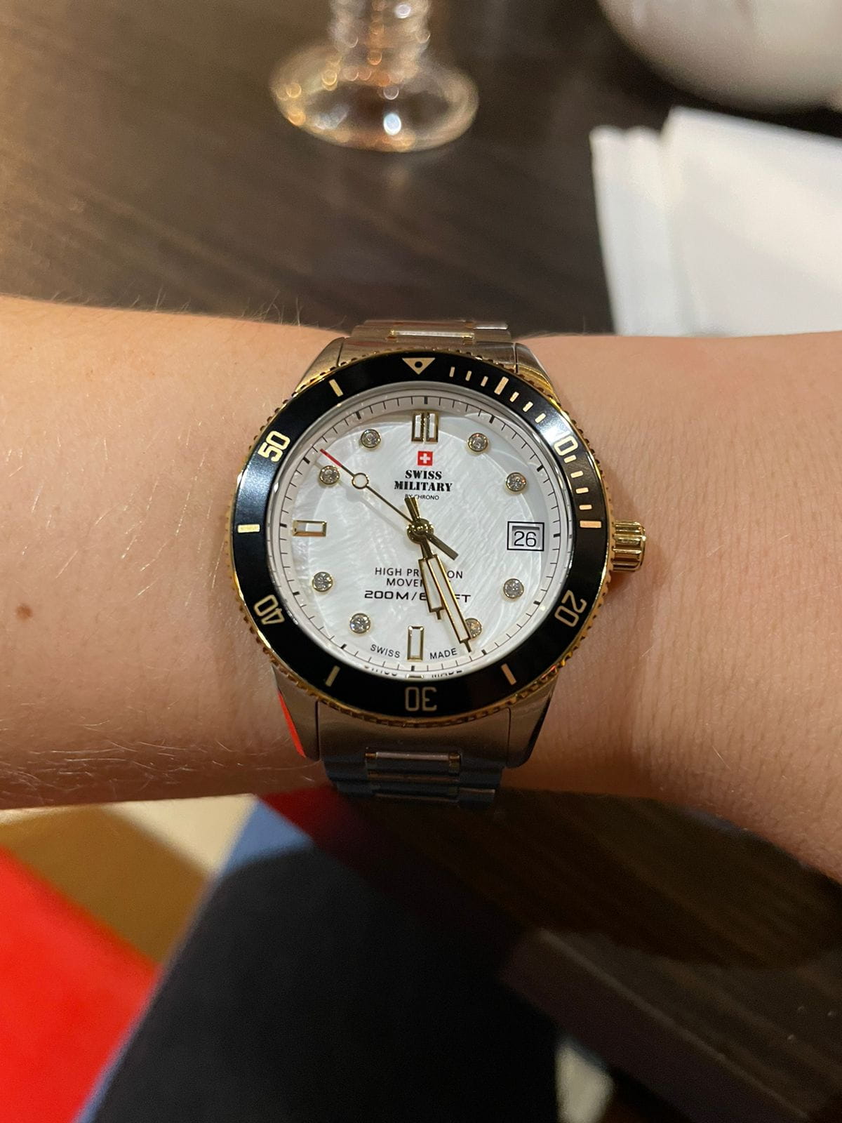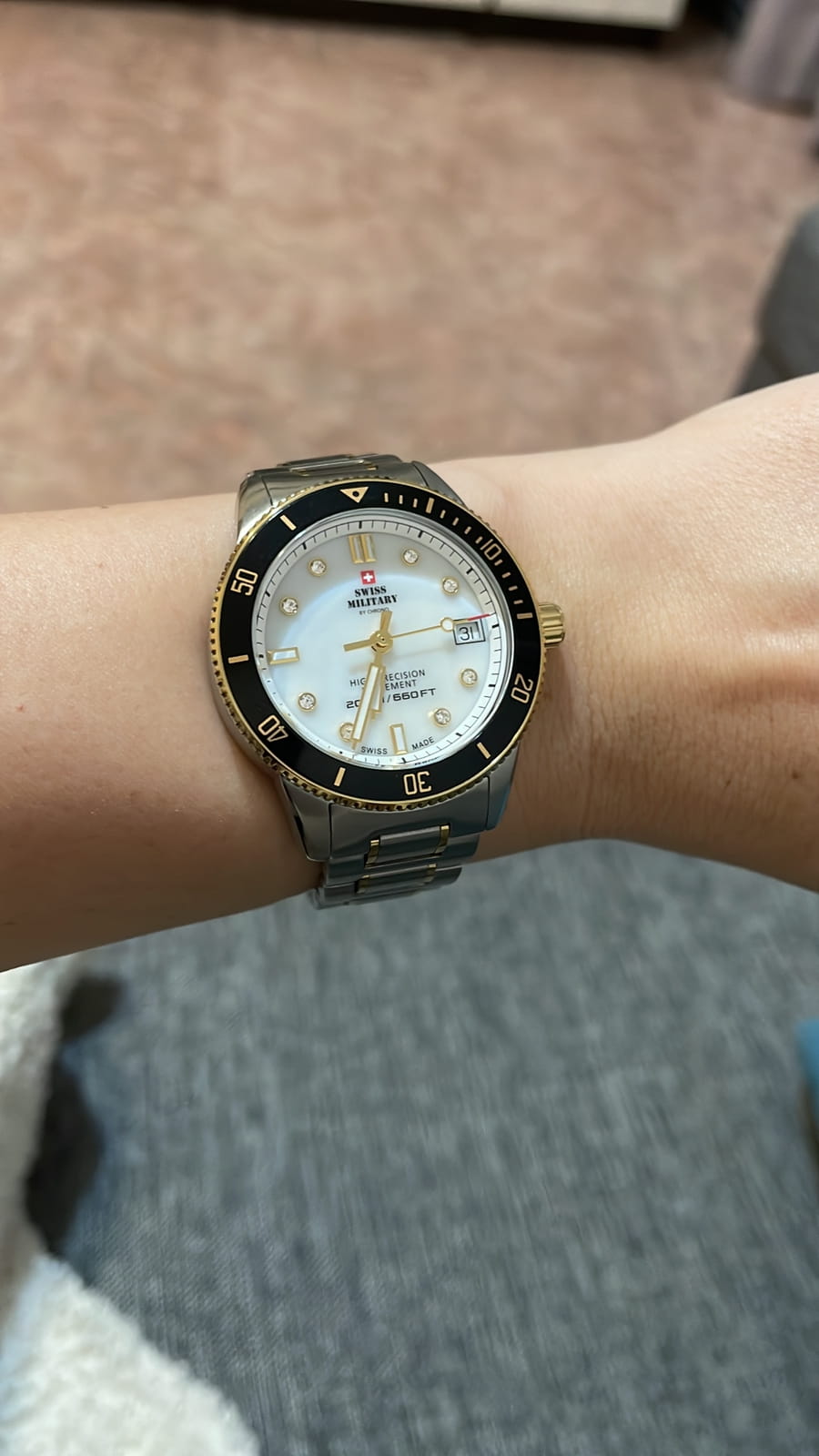 У данной модели диаметр корпуса 37 мм, Стальной браслет - все как я хотела .Страна производитель - Швейцария Есть индикация даты. Стрелки и метки с люминесцентным покрытием. Перламутровый циферблат с часовыми индексами в виде штрихов и точек. Корпус выполнен из нержавеющей стали с частичным PVD покрытием