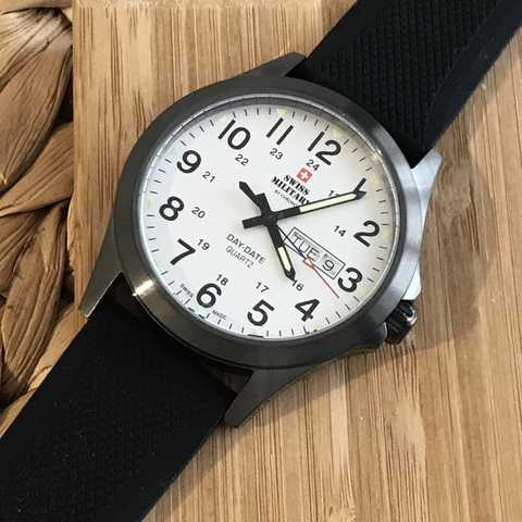 Мужские швейцарские наручные часы с минеральным стекломМинеральное стеклоМинеральное стекло представляет собой искусственно выращенный минерал кварца. Такое стекло отличается особой устойчивостью к повреждениям и царапинам. Уступает по некоторым качествам сапфировому стеклу. Swiss Military by Chrono Day Date SMP36040.20, кварцевый механизм с высокой точностью. Класс водозащиты: 50 метров, позволит защитить корпус от случайных брызг или капель дождя. Корпус часов изготовлен из стали нержавеющей с PVDPVDУльтратонкое покрытие наносится в технике вакуумного напыления, сочетает в себе нитрид титана особой прочности со слоем золота или оксида хрома. Несёт в себе декоративную или защитную функцию. покрытием. Стрелки и метки с люминесцентной подсветкойЛюминесцентное покрытиеПозволяет считывать показания времени в темноте. Производители наносят на стрелки, часовые индексы, безель или поверхность циферблата светонакопительный состав, дающий холодное свечение.. Каучуковый ремешок на стандартной застежке.