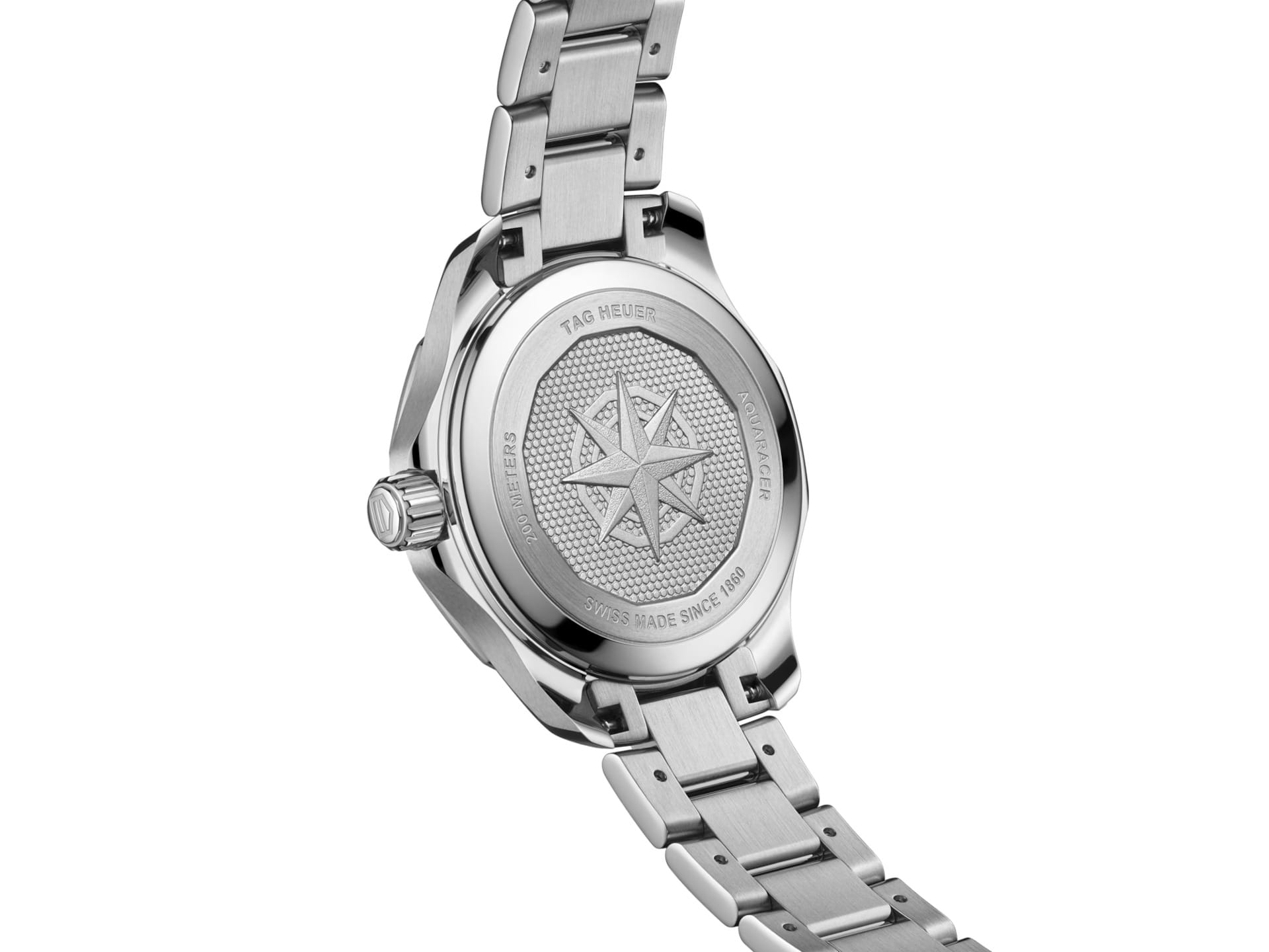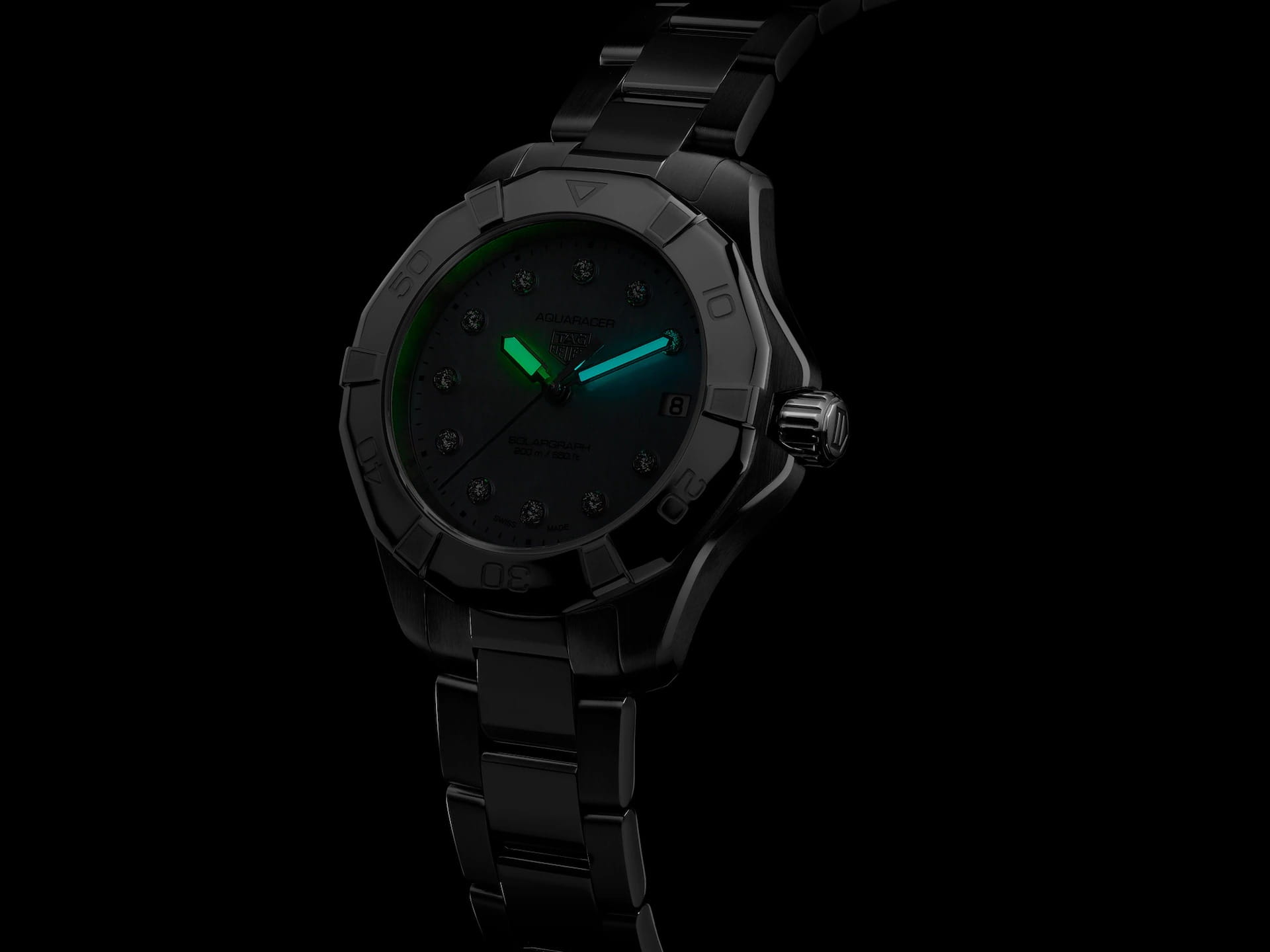 Женские швейцарские наручные кварцевые часы на солнечной батарейке TAG Heuer Aquaracer Professional Solargraph WBP1312.BA0005. Сапфировое стеклоСапфировое стеклоПрочный и надёжный материал из кристалла сапфира синтетического происхождения, характеризующийся особой твёрдостью и устойчивостью к царапинам и повреждениям. устойчивое к появлению царапин, обладающее высокой прозрачностью. Стрелки и метки с люминесцентным покрытиемЛюминесцентное покрытиеПозволяет считывать показания времени в темноте. Производители наносят на стрелки, часовые индексы, безель или поверхность циферблата светонакопительный состав, дающий холодное свечение. Super-LumiNova. Класс водозащиты: 200 метров, позволит плавать, нырять и заниматься другими водными видами спорта. Корпус часов изготовлен из нержавеющей стали. Браслет с раскладной застёжкойРаскладная застёжкаТакой тип застёжки используется только на браслетах из металла. Она никогда не раскрывается полностью, происходит разделение на 2 и более частей. Раскладывающая застёжка снизит вероятность потери часов к минимуму.. Вращающийся стальной безельБезельВнешний ободок, закрепляющий стекло. В спортивных часах так называется поворотное кольцо с делениями на циферблате, выполняет роль таймера – замеряет отрезки времени на шкале. Неподвижный безель – элемент декора. Однонаправленно вращающийся безель на дайверских часах позволяет фиксировать моменты погружения и выныривания на поверхность.. Окошко даты находится в положении 3 часа. Циферблат инкрустирован бриллиантами.