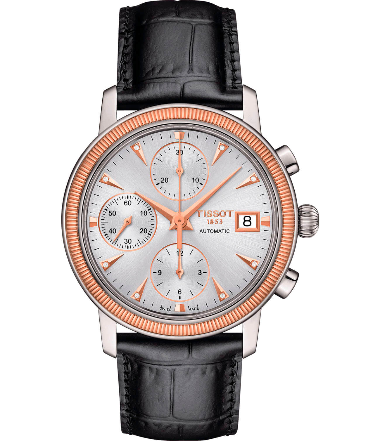 Наручные часы со светлым циферблатом лучше всего подойдут к дорогому костюму, создавая полноценный завершённый образ. Премиальный хронографХронографФункция позволяет измерять отрезки времени с особой точностью: часы, минуты, секунды. Верным признаком хронографа является наличие на циферблате 3 дополнительных окошек-счётчиков. имеет надёжный корпус из нержавеющей стали 316L, дополненный фигурным безелемБезельВнешний ободок, закрепляющий стекло. В спортивных часах так называется поворотное кольцо с делениями на циферблате, выполняет роль таймера – замеряет отрезки времени на шкале. Неподвижный безель – элемент декора. Однонаправленно вращающийся безель на дайверских часах позволяет фиксировать моменты погружения и выныривания на поверхность. из 18-ти каратного розового золота18-каратное золотоОбозначение по каратной системе пробирования, оно показывает, сколько драгоценного металла содержится в изделии. 18 карат - в составе 75% чистого золота, соответствует 750 пробе.