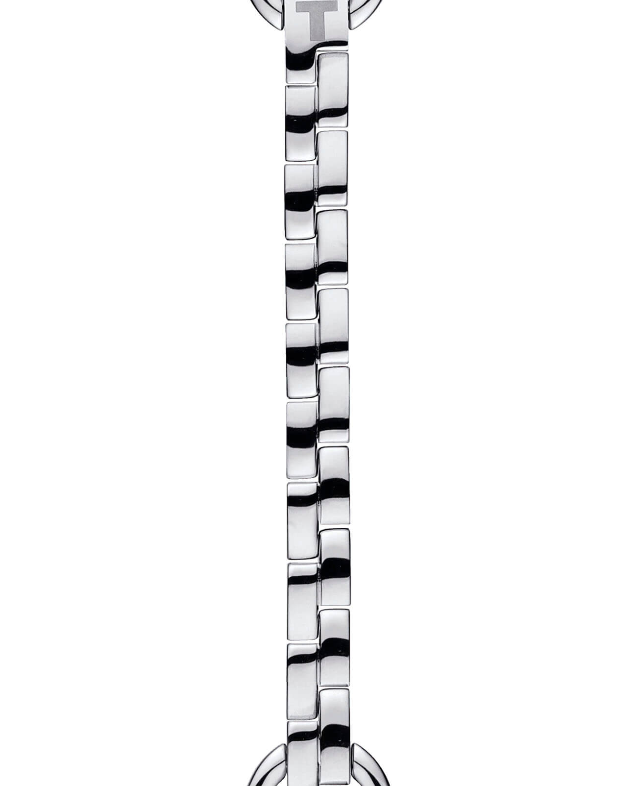 Стальной браслет с кольцевидными звеньями дополнен минималистичым циферблатом с оригинальным оформлением: белоснежная серединка и перламутровая вставка по окружности. Вместо часовых индексов использованы бриллианты. Кварцевый калибр ETA F03.111. Узнаваемый дизайн. Водостойкость до 50 метров. Сапфировое стекло устойчиво к образованию царапин. Индикация даты, функция EOLEOLПредставляет собой систему, уведомляющую владельца часов о необходимости замены элемента питания. За 2 недели до полного разряда батарейки секундная стрелка перестаёт ходить чётко и начинает перепрыгивать на 3-4 деления.. Габариты: 26 x 26 x 7 мм.