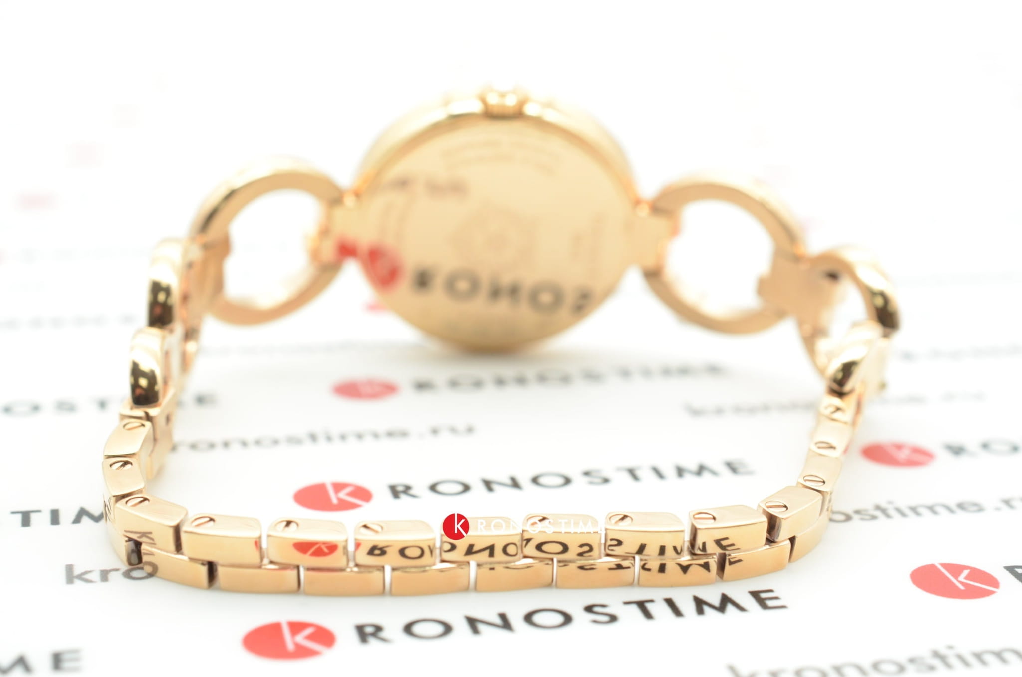Наручные часы в классическом стиле отличаются лаконичным исполнением, но отдельные детали добавляют роскоши. Модель инкрустирована 12 бриллиантами в 0,0156 карат, расположенными по окружности циферблата. Оригинальный браслет с кольцевидными звеньями и корпус имеют PVD-покрытиеPVDУльтратонкое покрытие наносится в технике вакуумного напыления, сочетает в себе нитрид титана особой прочности со слоем золота или оксида хрома. Несёт в себе декоративную или защитную функцию. оттенка розового золота. Кварцевый калибр ETA F03.111 с 3 камнями. Водостойкость 5 бар. Круглое окошко даты. Габариты: 30 x 30 x 6,35 мм.