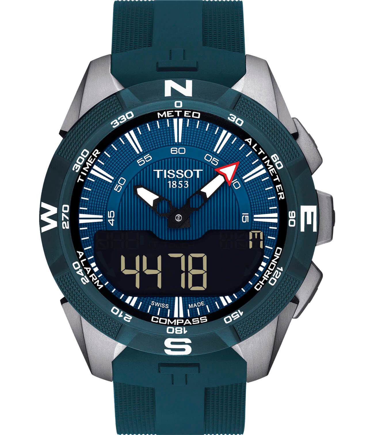 Наручные часы обладают расширенным списком дополнительных возможностей, позволяющих быстро решать повседневные задачи, модель будет идеальным карманным помощником в путешествиях. Среди функций: термометр, компас, мировое времяМировое время Полезное часовое усложнение, отображающее время в основных городах и известных областях по всему миру, оно связано с часовыми поясами, удобно для путешественников и бизнесменов. , вечный календарь, альтиметр, хронографХронографФункция позволяет измерять отрезки времени с особой точностью: часы, минуты, секунды. Верным признаком хронографа является наличие на циферблате 3 дополнительных окошек-счётчиков., таймер с обратным отсчётом времени. Аксессуар с кварцевым механизмом ETA E84.301 получает питание от солнечного света - технология . Управление осуществляется с помощью сенсорного тактильного стекла с антибликовой поверхностью. Керамический безельБезельВнешний ободок, закрепляющий стекло. В спортивных часах так называется поворотное кольцо с делениями на циферблате, выполняет роль таймера – замеряет отрезки времени на шкале. Неподвижный безель – элемент декора. Однонаправленно вращающийся безель на дайверских часах позволяет фиксировать моменты погружения и выныривания на поверхность.. Корпус из гипоаллергенного титана. Водостойкость 100 метров. Гибкий силиконовый ремешок. Индикатор EOLEOLПредставляет собой систему, уведомляющую владельца часов о необходимости замены элемента питания. За 2 недели до полного разряда батарейки секундная стрелка перестаёт ходить чётко и начинает перепрыгивать на 3-4 деления.. Габариты: 45 x 45 x 13,1 мм.