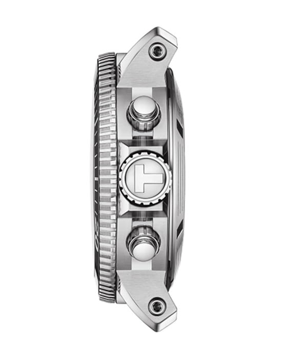 Градиентный синий циферблат имеет метки и стрелки, дополненные люминесцентным покрытиемЛюминесцентное покрытиеПозволяет считывать показания времени в темноте. Производители наносят на стрелки, часовые индексы, безель или поверхность циферблата светонакопительный состав, дающий холодное свечение.. Поворотный керамический безельБезельВнешний ободок, закрепляющий стекло. В спортивных часах так называется поворотное кольцо с делениями на циферблате, выполняет роль таймера – замеряет отрезки времени на шкале. Неподвижный безель – элемент декора. Однонаправленно вращающийся безель на дайверских часах позволяет фиксировать моменты погружения и выныривания на поверхность. защищён от царапин. Модель отличается повышенной водостойкостью в 30 бар. Заводная головка около позиции 10 часов имеет гелиевый клапан для отвода газа – запатентованное изобретение Tissot. Часы комплектуются швейцарским высококлассным и надежным механизмом хронографом с автоподзаводом и изысканным декором ETA Valjoux A05.H21ValjouxПремиальный калибр от швейцарской компании ETA c уникальной отделкой механизма. Отличается увеличенным запасом хода от 45 до 60 часов, в зависимости от калибра, точность хода составляет +/- 5 секунд в сутки. с запасом хода на 60 часов. Функции: хронографХронографФункция позволяет измерять отрезки времени с особой точностью: часы, минуты, секунды. Верным признаком хронографа является наличие на циферблате 3 дополнительных окошек-счётчиков., секундомер, календарь. Модель поставляется в оригинальном кейсе с дополнительным каучуковым ремешком.