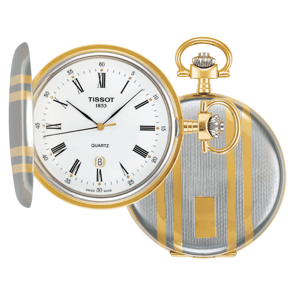 Карманные швейцарские часы Tissot Savonnette T83.8.553.13, кварцевый механизм с высокой точностью. Класс водозащиты: 30 метров, позволит защитить корпус от случайных брызг или капель дождя. Корпус часов изготовлен из золотой и палладиевой латуни.