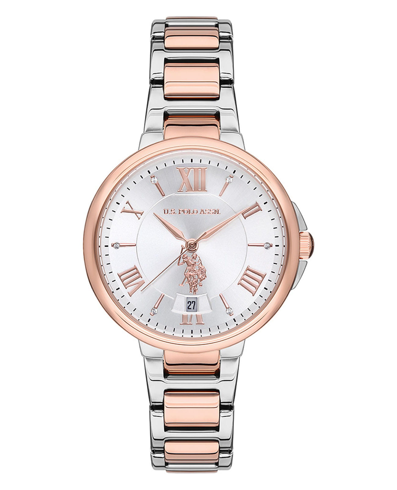 Женские часы U.S. Polo Assn Stile USPA2012-04 кварцевый механизм с высокой точностью. Минеральное стеклоМинеральное стеклоМинеральное стекло представляет собой искусственно выращенный минерал кварца. Такое стекло отличается особой устойчивостью к повреждениям и царапинам. Уступает по некоторым качествам сапфировому стеклу. устойчивое к появлению царапин, обладающее высокой прозрачностью. Корпус часов изготовлен из нержавеющей стали. БезельБезельВнешний ободок, закрепляющий стекло. В спортивных часах так называется поворотное кольцо с делениями на циферблате, выполняет роль таймера – замеряет отрезки времени на шкале. Неподвижный безель – элемент декора. Однонаправленно вращающийся безель на дайверских часах позволяет фиксировать моменты погружения и выныривания на поверхность. с IP-покрытиемIP-покрытиеМетод ионного напыления. Демонстрирует повышенную устойчивость к истиранию, окислению и химическим веществам. Под воздействием высокого давления и температуры около 1500°C молекулы металла надёжно соединяются с частицами корпуса часов.. Циферблат украшен кристаллами. Окошко даты находится в положении 6 часов. Класс водозащиты: 50 метров, позволит защитить корпус от случайных брызг или капель дождя. Стальной браслет с частичным IP-покрытиемIP-покрытиеМетод ионного напыления. Демонстрирует повышенную устойчивость к истиранию, окислению и химическим веществам. Под воздействием высокого давления и температуры около 1500°C молекулы металла надёжно соединяются с частицами корпуса часов. на ювелирной застежке.