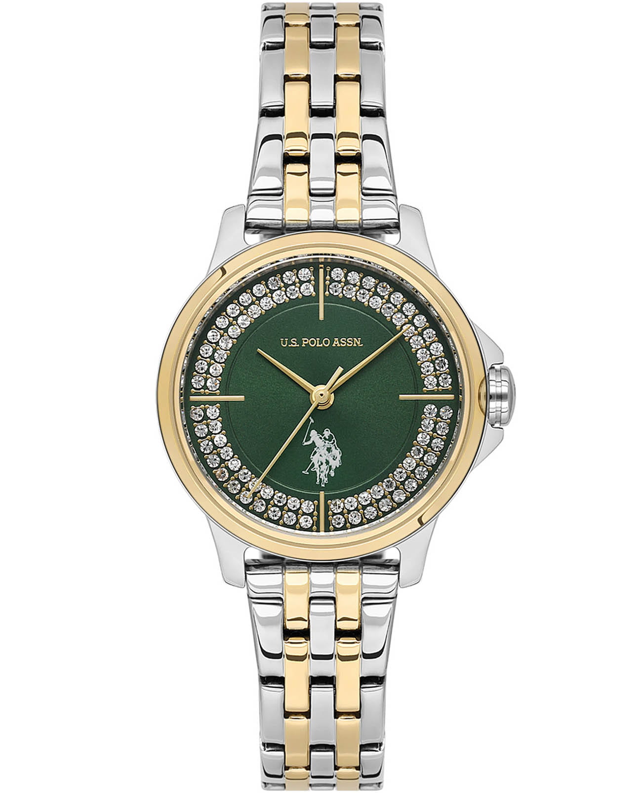 Женские элегантные часы U.S. Polo Assn. Stile USPA2081-04, кварцевый механизм с высокой точностью. Минеральное стеклоМинеральное стеклоМинеральное стекло представляет собой искусственно выращенный минерал кварца. Такое стекло отличается особой устойчивостью к повреждениям и царапинам. Уступает по некоторым качествам сапфировому стеклу. устойчивое к появлению царапин, обладающее высокой прозрачностью. Изысканный корпус изготовлен из нержавеющей стали с безелемБезельВнешний ободок, закрепляющий стекло. В спортивных часах так называется поворотное кольцо с делениями на циферблате, выполняет роль таймера – замеряет отрезки времени на шкале. Неподвижный безель – элемент декора. Однонаправленно вращающийся безель на дайверских часах позволяет фиксировать моменты погружения и выныривания на поверхность. с IP-покрытиемIP-покрытиеМетод ионного напыления. Демонстрирует повышенную устойчивость к истиранию, окислению и химическим веществам. Под воздействием высокого давления и температуры около 1500°C молекулы металла надёжно соединяются с частицами корпуса часов.. Лаконичные золотистые центральные часовая, минутная и секундная стрелки. Водонепроницаемость 3 АТМ позволяет использовать часы в повседневных условиях — при мытье рук или под лёгким дождём. Браслет выполнен из стали с IP-покрытиемIP-покрытиеМетод ионного напыления. Демонстрирует повышенную устойчивость к истиранию, окислению и химическим веществам. Под воздействием высокого давления и температуры около 1500°C молекулы металла надёжно соединяются с частицами корпуса часов. и оснащён раскладной застёжкойРаскладная застёжкаТакой тип застёжки используется только на браслетах из металла. Она никогда не раскрывается полностью, происходит разделение на 2 и более частей. Раскладывающая застёжка снизит вероятность потери часов к минимуму., обеспечивающей комфорт и уверенную фиксацию на запястье, а также добавляя завершающий штрих к этому стильному аксессуару. Циферблат с кристаллами подчёркивает изысканный характер часов, создавая универсальный образ, подходящий как для повседневных ситуаций, так и для особых случаев.