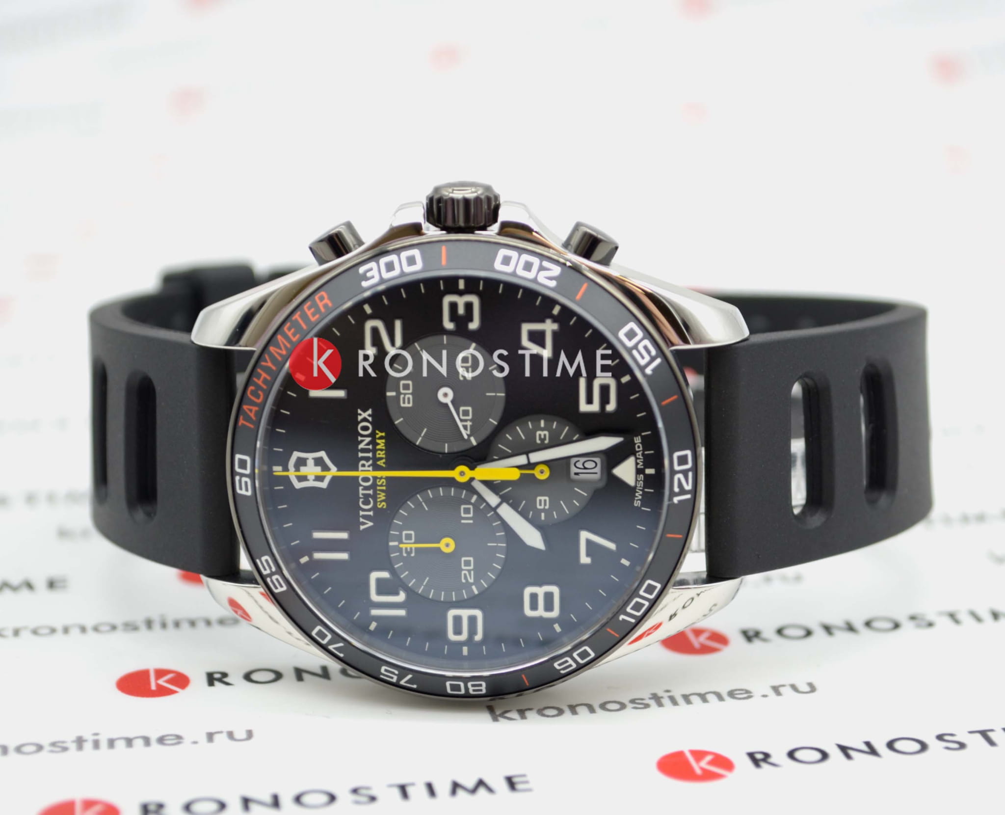 Мужские швейцарские часы-хронографХронографФункция позволяет измерять отрезки времени с особой точностью: часы, минуты, секунды. Верным признаком хронографа является наличие на циферблате 3 дополнительных окошек-счётчиков. Victorinox Fieldforce Sport Chronograph 241892 с надёжным кварцевым механизмом. Сапфировое стеклоСапфировое стеклоПрочный и надёжный материал из кристалла сапфира синтетического происхождения, характеризующийся особой твёрдостью и устойчивостью к царапинам и повреждениям. с трёхслойным антибликовым покрытием. Корпус часов выполнен из нержавеющей стали 316L. Практичный резиновый ремешок на стандартной застёжке. Влагозащита: 100 метров, позволит плавать, нырять и заниматься другими водными видами спорта. Окошко даты находится в положении 6 часов, стрелки и метки с люминесцентным покрытиемЛюминесцентное покрытиеПозволяет считывать показания времени в темноте. Производители наносят на стрелки, часовые индексы, безель или поверхность циферблата светонакопительный состав, дающий холодное свечение., тахиметрТахиметрРазмеченная шкала, располагается на ободке или безеле часов. Тахиметр позволяет рассчитать скорость на определённом участке пути, расстояние измеряется в километрах или милях..