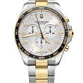Мужские швейцарские часы-хронографХронографФункция позволяет измерять отрезки времени с особой точностью: часы, минуты, секунды. Верным признаком хронографа является наличие на циферблате 3 дополнительных окошек-счётчиков. Victorinox Fieldforce Chronograph 241903 с надёжным кварцевым механизмом. Сапфировое стеклоСапфировое стеклоПрочный и надёжный материал из кристалла сапфира синтетического происхождения, характеризующийся особой твёрдостью и устойчивостью к царапинам и повреждениям. с трёхслойным антибликовым покрытием. Корпус часов выполнен из нержавеющей стали 316L. Стальной браслет с частичным PVD-покрытиемPVDУльтратонкое покрытие наносится в технике вакуумного напыления, сочетает в себе нитрид титана особой прочности со слоем золота или оксида хрома. Несёт в себе декоративную или защитную функцию. на раскладной застёжкеРаскладная застёжкаТакой тип застёжки используется только на браслетах из металла. Она никогда не раскрывается полностью, происходит разделение на 2 и более частей. Раскладывающая застёжка снизит вероятность потери часов к минимуму.. Влагозащита: 100 метров, позволит плавать, нырять и заниматься другими водными видами спорта. Окошко даты находится в положении 6 часов, стрелки и метки с люминесцентным покрытиемЛюминесцентное покрытиеПозволяет считывать показания времени в темноте. Производители наносят на стрелки, часовые индексы, безель или поверхность циферблата светонакопительный состав, дающий холодное свечение., тахиметрТахиметрРазмеченная шкала, располагается на ободке или безеле часов. Тахиметр позволяет рассчитать скорость на определённом участке пути, расстояние измеряется в километрах или милях..
