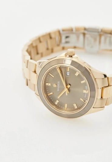 Стальной корпус круглой формы выполнен из нержавеющей стали марки 316L с PVD-покрытиемPVDУльтратонкое покрытие наносится в технике вакуумного напыления, сочетает в себе нитрид титана особой прочности со слоем золота или оксида хрома. Несёт в себе декоративную или защитную функцию., что придает часам премиальный внешний вид и делает их устойчивыми к механическим повреждениям. Циферблат украшен фирменным логотипом Wainer и накладными метками в виде штрихов, чередующимися с блестящими цирконами, добавляющими особую роскошь и шарм.