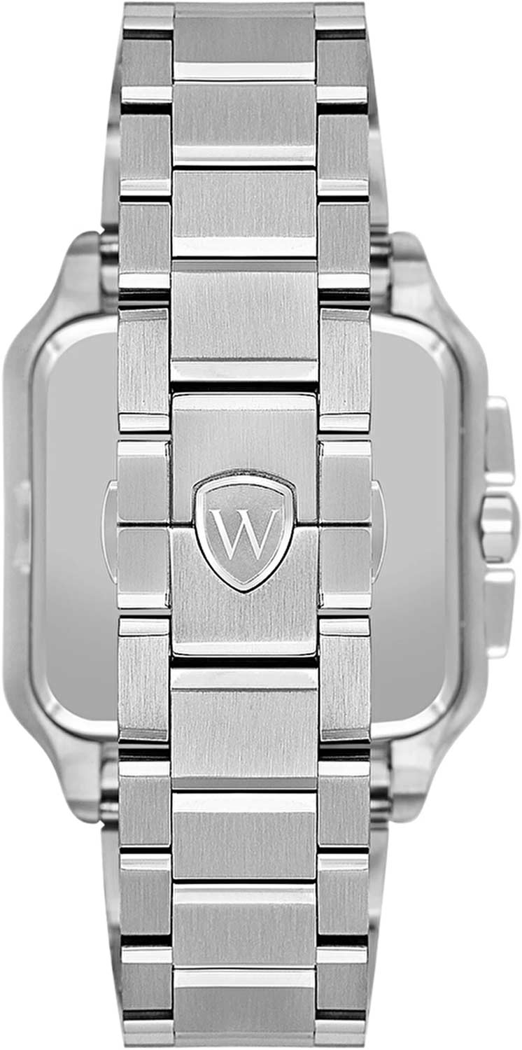 Мужские кварцевые часы Wainer WA.18090-E — это стильный аксессуар, сочетающий в себе швейцарское качество и изысканный дизайн. Модель выполнена в квадратной форме из стали 316L с частичным PVD-покрытиемPVDУльтратонкое покрытие наносится в технике вакуумного напыления, сочетает в себе нитрид титана особой прочности со слоем золота или оксида хрома. Несёт в себе декоративную или защитную функцию., что придаёт ей благородный внешний вид и устойчивость к царапинам. Корпус украшен декоративными винтами, подчёркивая внимание к деталям. Циферблат белого цвета дополнен штриховыми метками и римскими цифрами, а секундная стрелка на конце декорирована буквой W, добавляя модели индивидуальности. Защиту механизма обеспечивает сапфировое стеклоСапфировое стеклоПрочный и надёжный материал из кристалла сапфира синтетического происхождения, характеризующийся особой твёрдостью и устойчивостью к царапинам и повреждениям., устойчивое к повреждениям. Окошко даты расположено в положении 4 часов, а гранёная заводная головка с защитой оснащена фирменным логотипом. Браслет из стали 316L шириной 22 мм оснащён Раскладная застёжкаРаскладная застёжкаТакой тип застёжки используется только на браслетах из металла. Она никогда не раскрывается полностью, происходит разделение на 2 и более частей. Раскладывающая застёжка снизит вероятность потери часов к минимуму., обеспечивающей комфорт и надёжную фиксацию на запястье. Водонепроницаемость позволяет использовать модель при мытье рук или под лёгким дождём. Стрелки с люминесцентным покрытиемЛюминесцентное покрытиеПозволяет считывать показания времени в темноте. Производители наносят на стрелки, часовые индексы, безель или поверхность циферблата светонакопительный состав, дающий холодное свечение. обеспечивают отличную читаемость даже в условиях слабого освещения. Механизм калибра Ronda 5030.D гарантирует точность хода и надёжность. Эти часы станут универсальным аксессуаром для тех, кто ценит сочетание стиля, функциональности и швейцарского мастерства — идеальный выбор для повседневной носки и торжественных случаев.