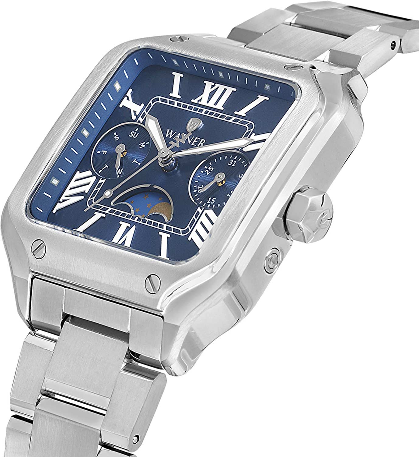 Женские кварцевые часы Wainer WA.18091-C — это стильный аксессуар, сочетающий в себе швейцарское качество и изысканный дизайн. Модель выполнена в квадратной форме из стали 316L с декоративными винтами, что придаёт ей прочность и устойчивость к царапинам. Циферблат дополнен штриховыми метками и римскими цифрами, а секундная стрелка на конце декорирована буквой W, подчёркивая внимание к деталям. Число, день недели и индикатор фазы Луны вынесены на отдельные циферблаты, что делает модель функциональной и выразительной. Защиту механизма обеспечивает сапфировое стеклоСапфировое стеклоПрочный и надёжный материал из кристалла сапфира синтетического происхождения, характеризующийся особой твёрдостью и устойчивостью к царапинам и повреждениям., устойчивое к повреждениям. Гранёная заводная головка с защитой оснащена фирменным логотипом, добавляя модели индивидуальности. Браслет из стали 316L шириной 16 мм оснащён Раскладная застёжкаРаскладная застёжкаТакой тип застёжки используется только на браслетах из металла. Она никогда не раскрывается полностью, происходит разделение на 2 и более частей. Раскладывающая застёжка снизит вероятность потери часов к минимуму., обеспечивающей комфорт и надёжную фиксацию на запястье. Водонепроницаемость позволяет использовать модель при мытье рук или под лёгким дождём. Стрелки с люминесцентным покрытиемЛюминесцентное покрытиеПозволяет считывать показания времени в темноте. Производители наносят на стрелки, часовые индексы, безель или поверхность циферблата светонакопительный состав, дающий холодное свечение. обеспечивают отличную читаемость даже в условиях слабого освещения. Механизм калибра Ronda 706.1 гарантирует точность хода и надёжность. Эти часы станут универсальным аксессуаром для тех, кто ценит сочетание стиля, функциональности и швейцарского мастерства — идеальный выбор для повседневной носки и торжественных случаев.